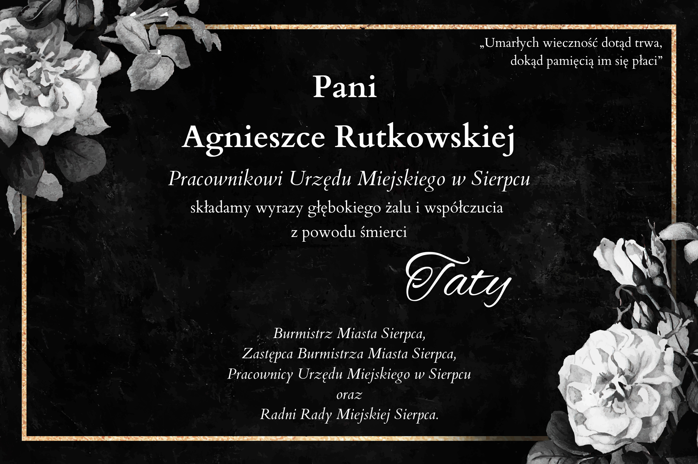Składamy wyrazy głębokiego żalu i współczucia Pani Agnieszce Rutkowskiej Pracownikowi Urzędu Miejskiego w Sierpcu z powodu śmierci Taty.