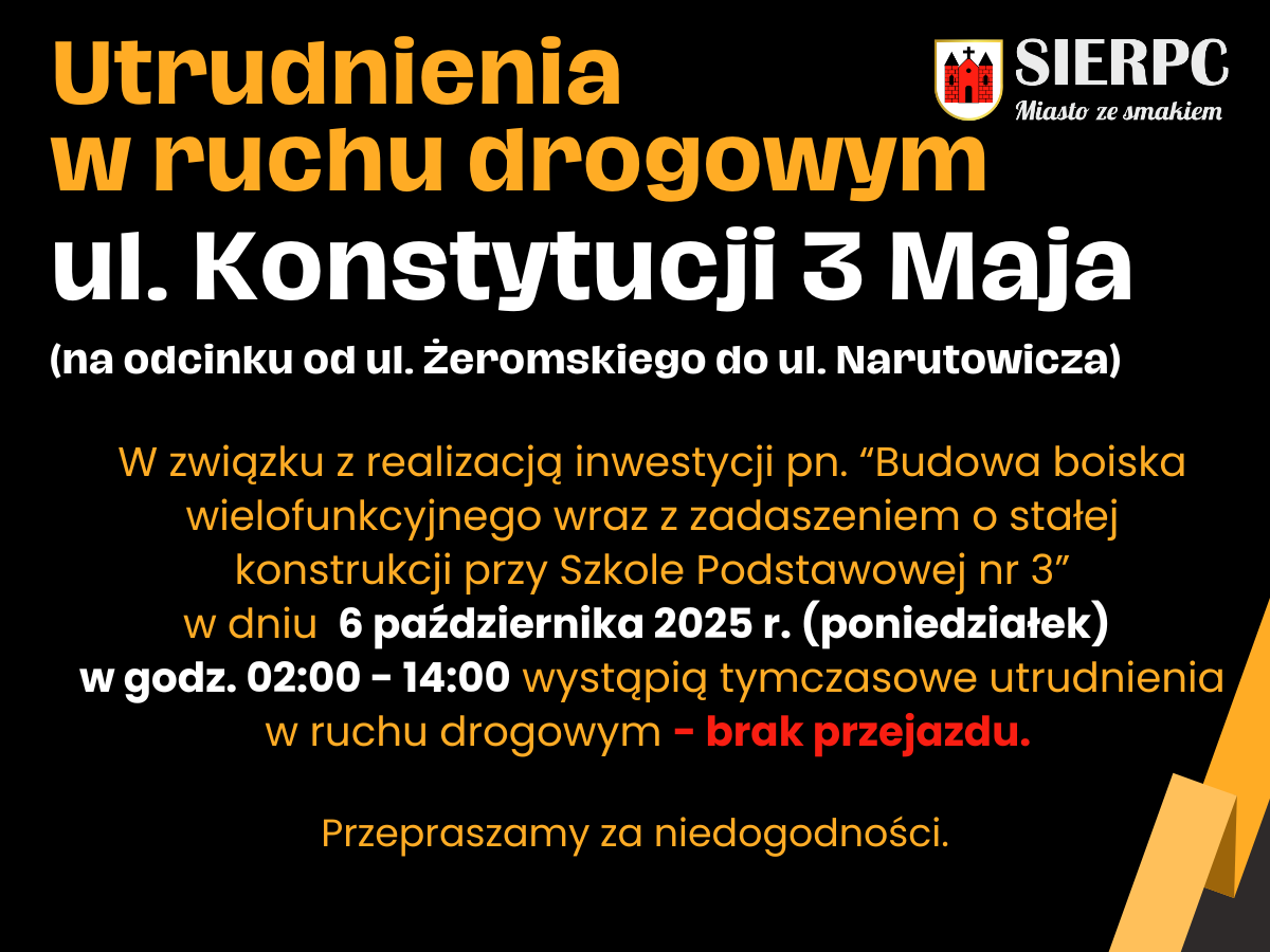 W związku z realizacją inwestycji pn. “Budowa boiska wielofunkcyjnego wraz z zadaszeniem o stałej konstrukcji przy Szkole Podstawowej nr 3”w dniu 6 października 2025 r. (poniedziałek) w godz. 02:00 – 14:00 wystąpią tymczasowe utrudnienia w ruchu drogowym – brak przejazdu.